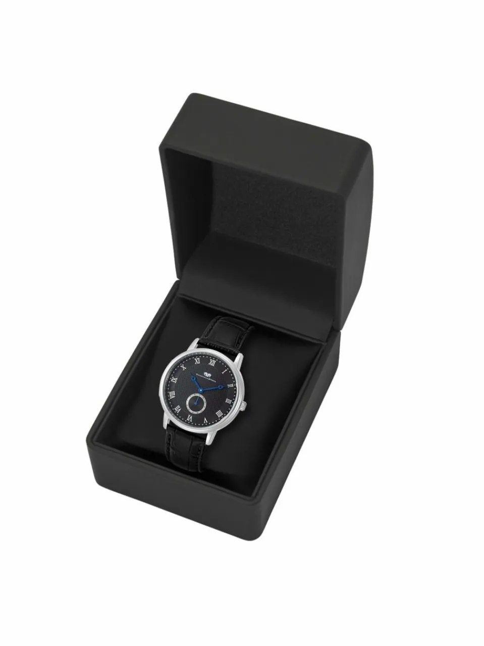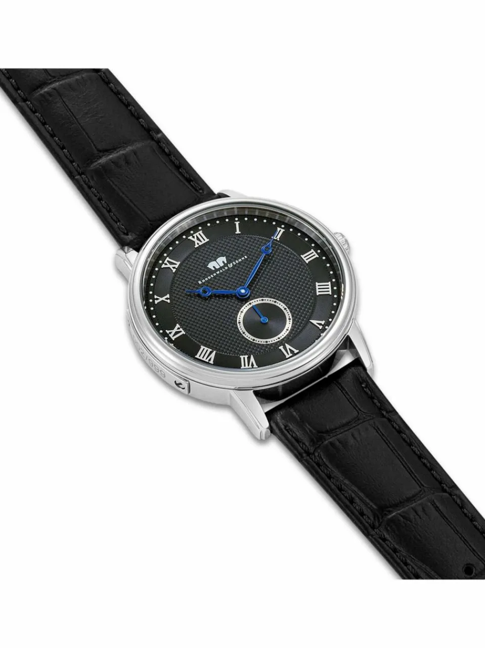 Dieses Uhrmodell der Manufaktur Rhodenwald & Söhne begeistert alle Uhrenliebhaber, die Wert auf stilvolles Understatement legen: Das minimalistische Zifferblatt punktet auf den zweiten Blick mit einer attraktiven Strukturierung und setzt auf traditionelle römische Ziffern und luminiszierende Breguet-Zeiger. Dezentes Design-Highlight ist die