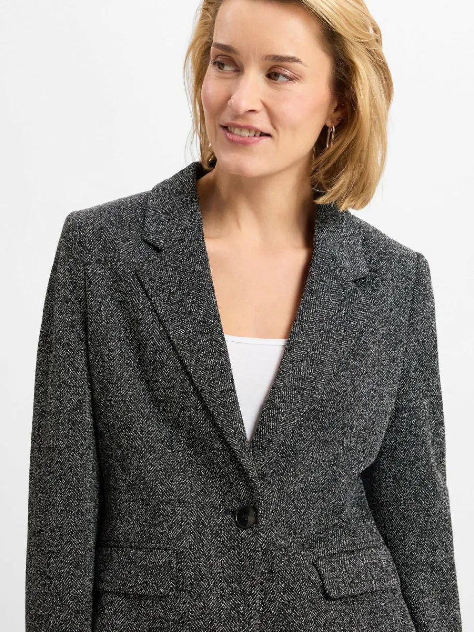 Die Melange-Optik lockert den klassischen Look des Blazers von s.Oliver BLACK LABEL mit Frischgratstruktur dynamisch auf. Der Blazer ist Teil eines Anzugs, kann aber auch allein getragen werden.