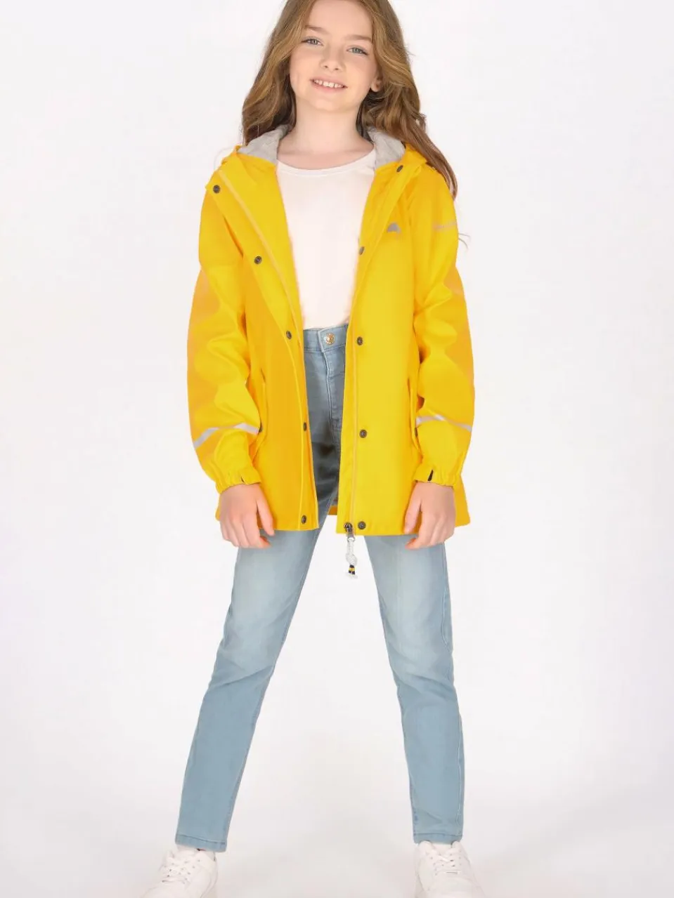 Ideal für junge Abenteurer: Diese wasserdichte Jacke besticht durch ihr praktisches Design mit Druckknopfverschluss und verstellbaren Manschetten. Mit einem Logo auf der Brust und einem reflektierenden Streifen für bessere Sichtbarkeit ausgestattet, hat sie zwei Fronttaschen mit Klappen. Das weiche Innenfutter sorgt für Komfort, während die Kapuze mit Schirm bei Outdoor-Aktivitäten Schutz vor den Elementen bietet.