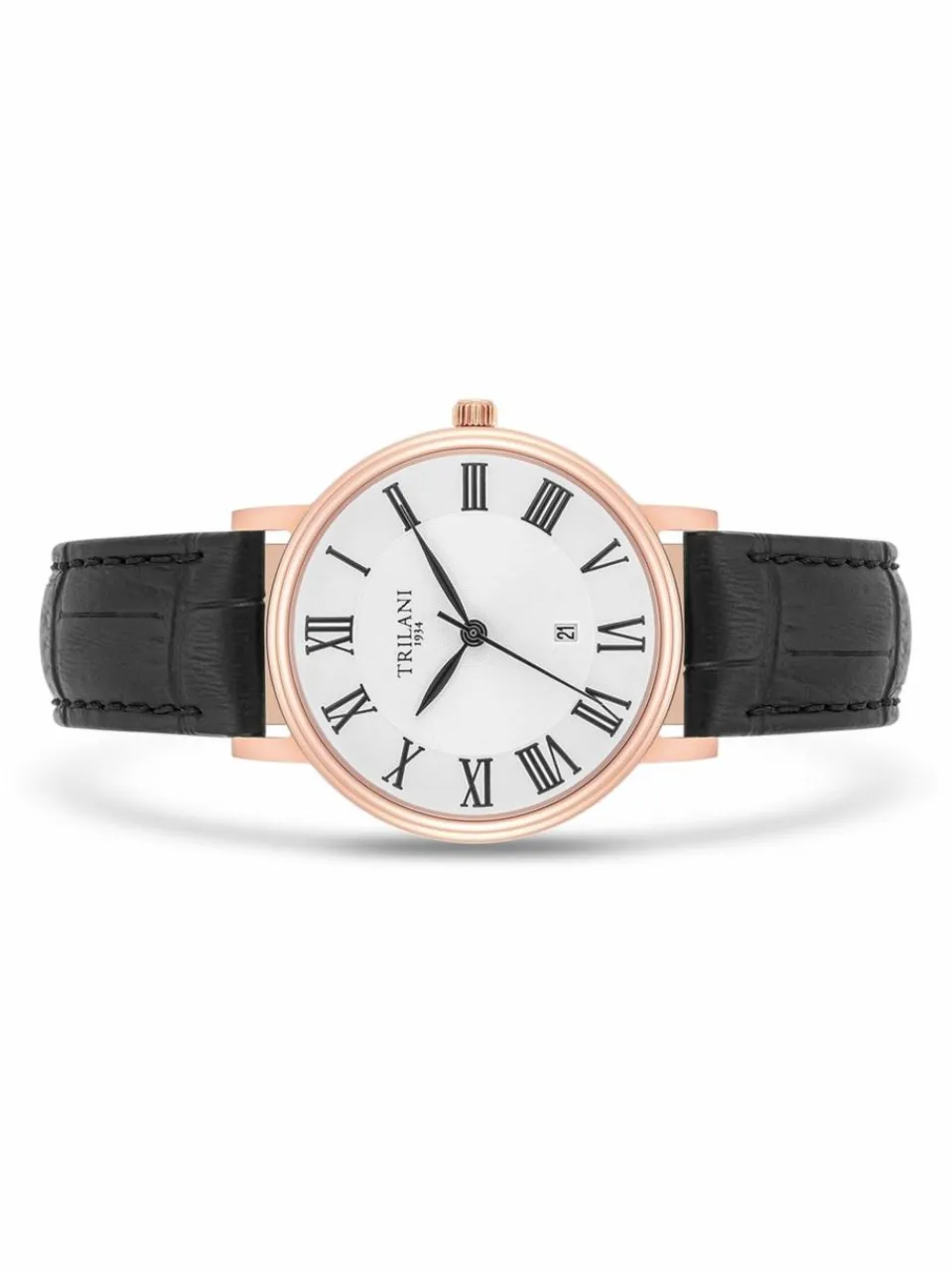 Sie mögen Uhren, die zeitlose Eleganz ausstrahlen? Dann ist diese Damenuhr der Marke Trilani eine wunderbare Wahl. Das feminine Modell begeistert mit einem klassischen Zifferblatt mit römischen Zahlen, zarten Feuille-Zeigern und Datumsanzeige. Das Edelstahlgehäuse mit Roségold-Plattierung und ein weiches Echtlederarmband mit Kroko-Prägung fügen sich zu einem harmonischen Gesamtkonzept zusammen und machen die Uhr zum stilvollen Begleiter in Beruf und Freizeit.