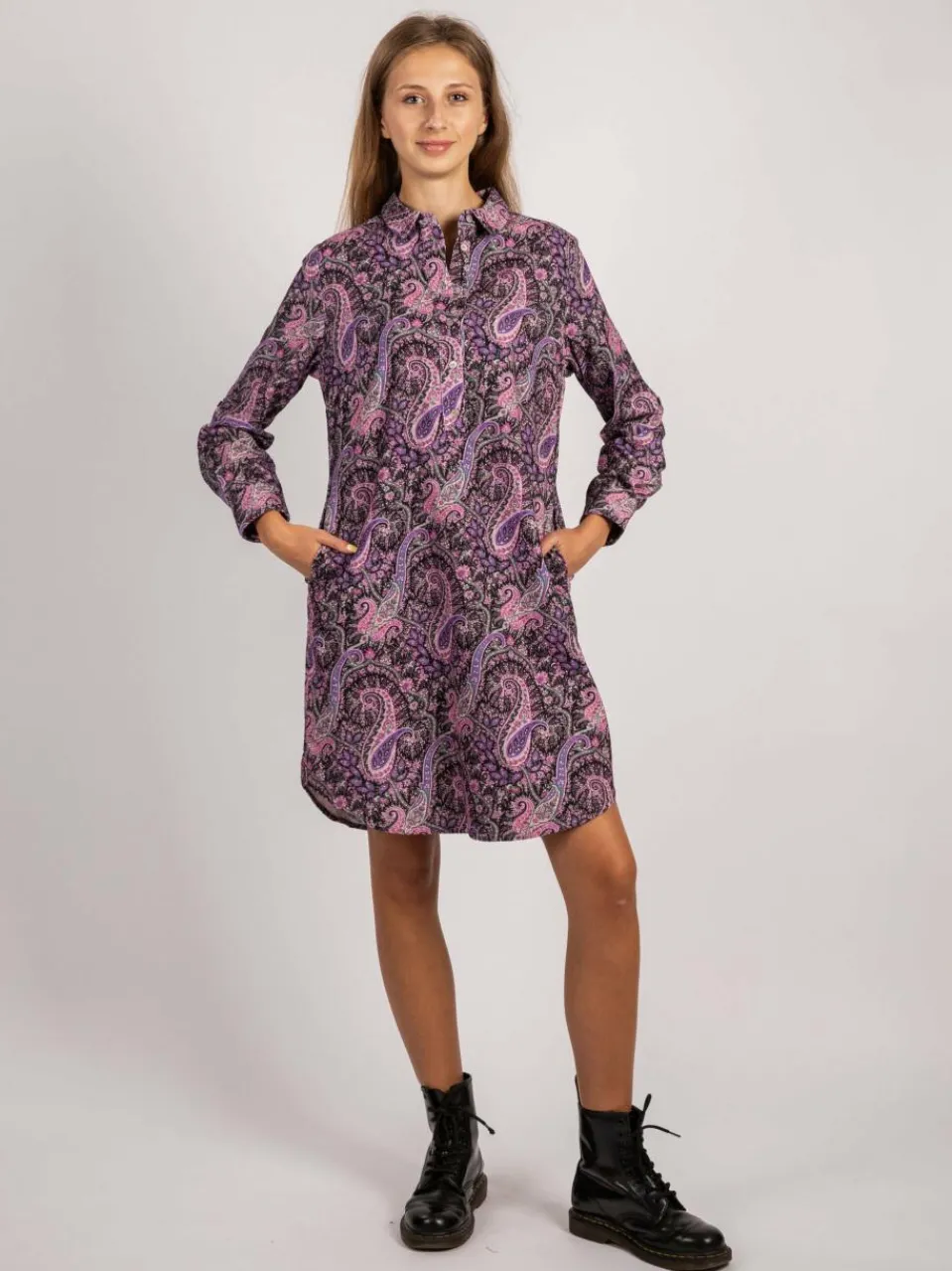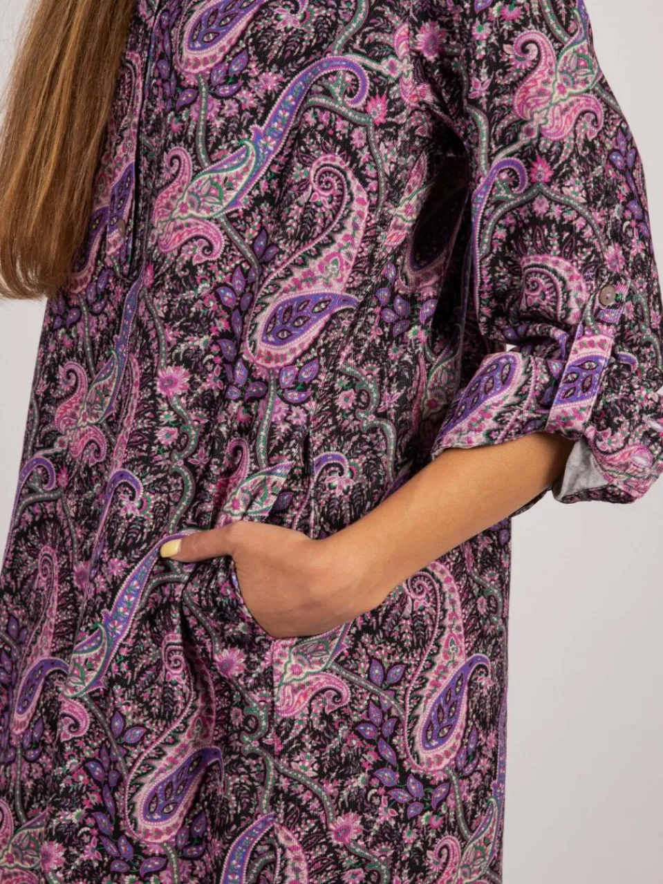 Hergestellt aus hochwertigem Cordstoff, ist dieses Kleid langlebig und pflegeleicht. Die weiche Textur des Cordstoffes sorgt für Komfort und Wärme. Die Knopfleiste vorne und der Paisley druck verleihen dem Kleid eine elegante Note. Tragen Sie es lässig mit Sneakers oder formell mit Stiefeln! Model trägt Größe 36 – Gesamtlänge: 96 cm, Brustweite: 98 cm, Taillenweite: 92 cm.