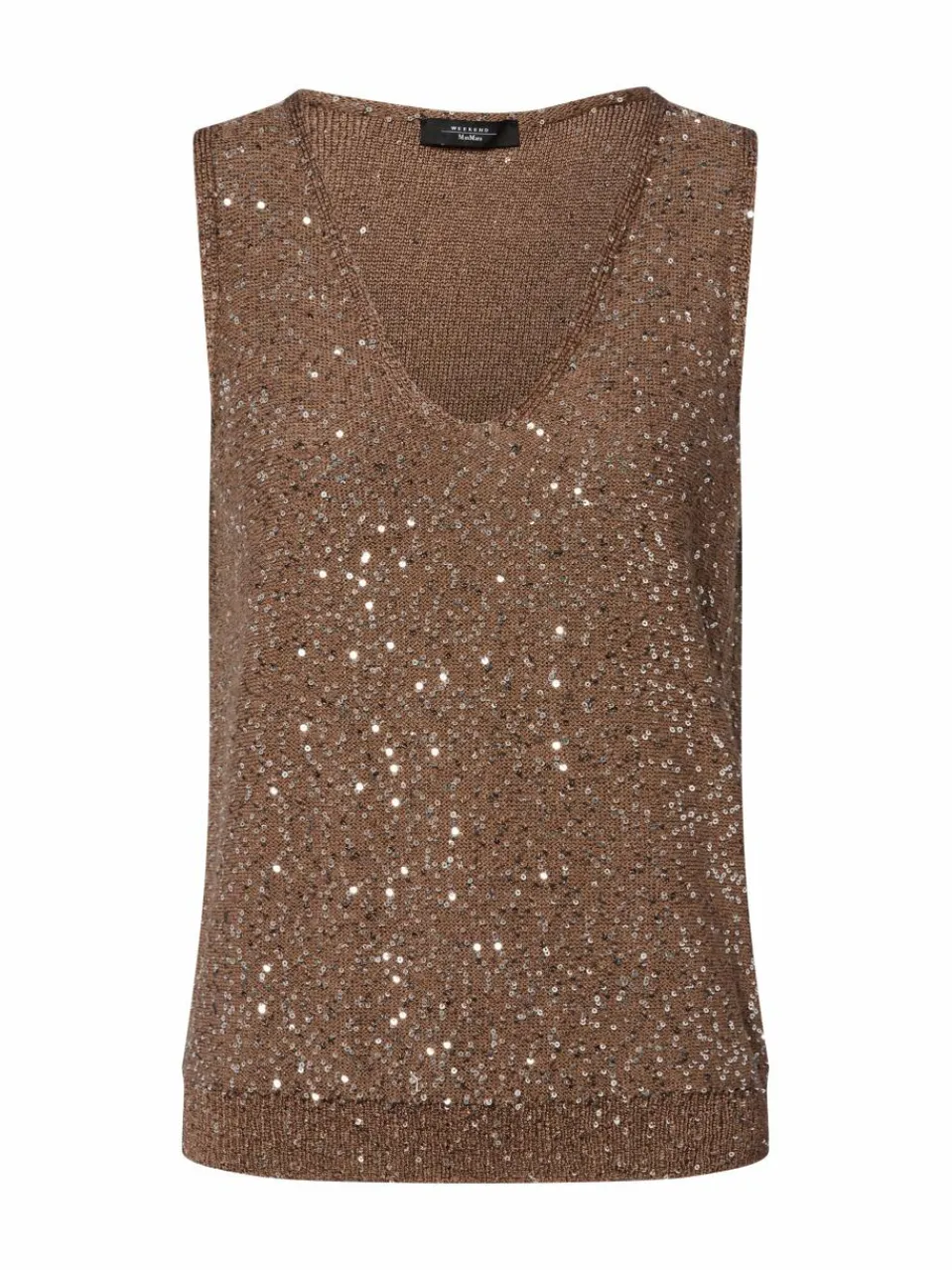 Im funkelnden Design mit zahlreichen Pailletten: das Stricktop Acaici von Weekend Max Mara mit V-Ausschnitt und Rippbündchen.