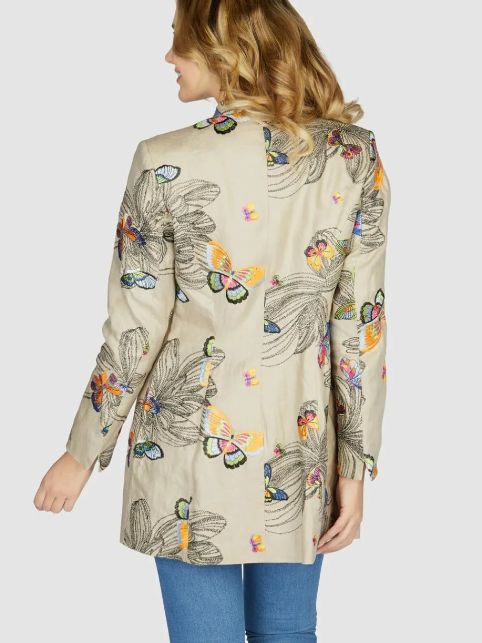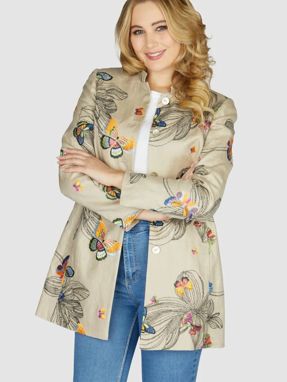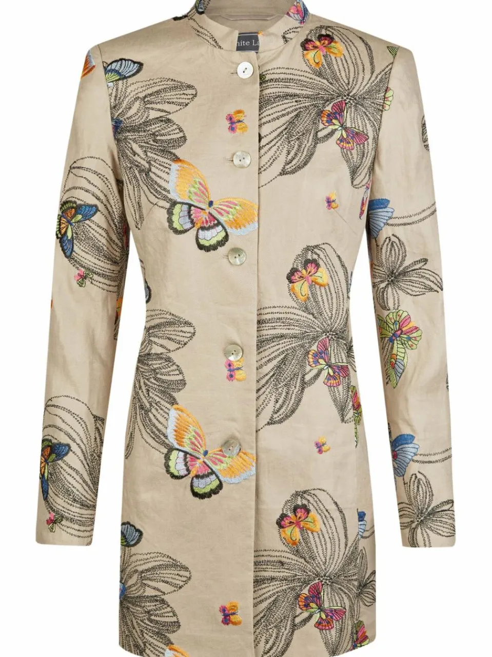 Gehrock aus allover besticktem Leinen mit Stehkragen, Nahttaschen und Ärmelschlitz, gefüttert.