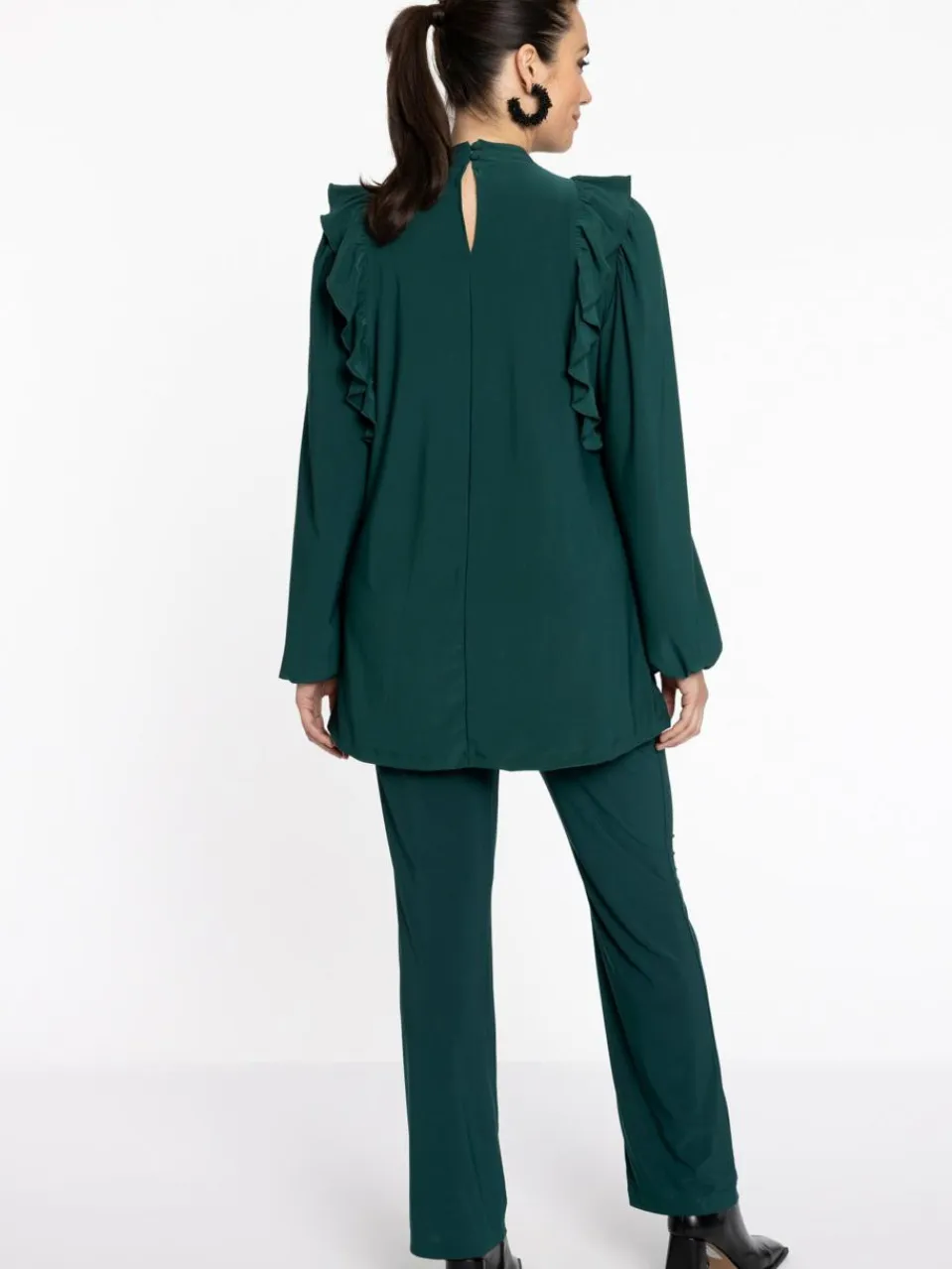 Diese Dolce-Bluse hat elegante Rüschendetails an den Schultern, die ihr einen Hauch von Weiblichkeit und Flair verleihen. Der hohe Ausschnitt und die langen Ärmel mit gerafften Manschetten sorgen für eine raffinierte Silhouette, die sowohl bequem als auch stilvoll ist. Perfekt sowohl für professionelle Anlässe als auch für legere Ausflüge!