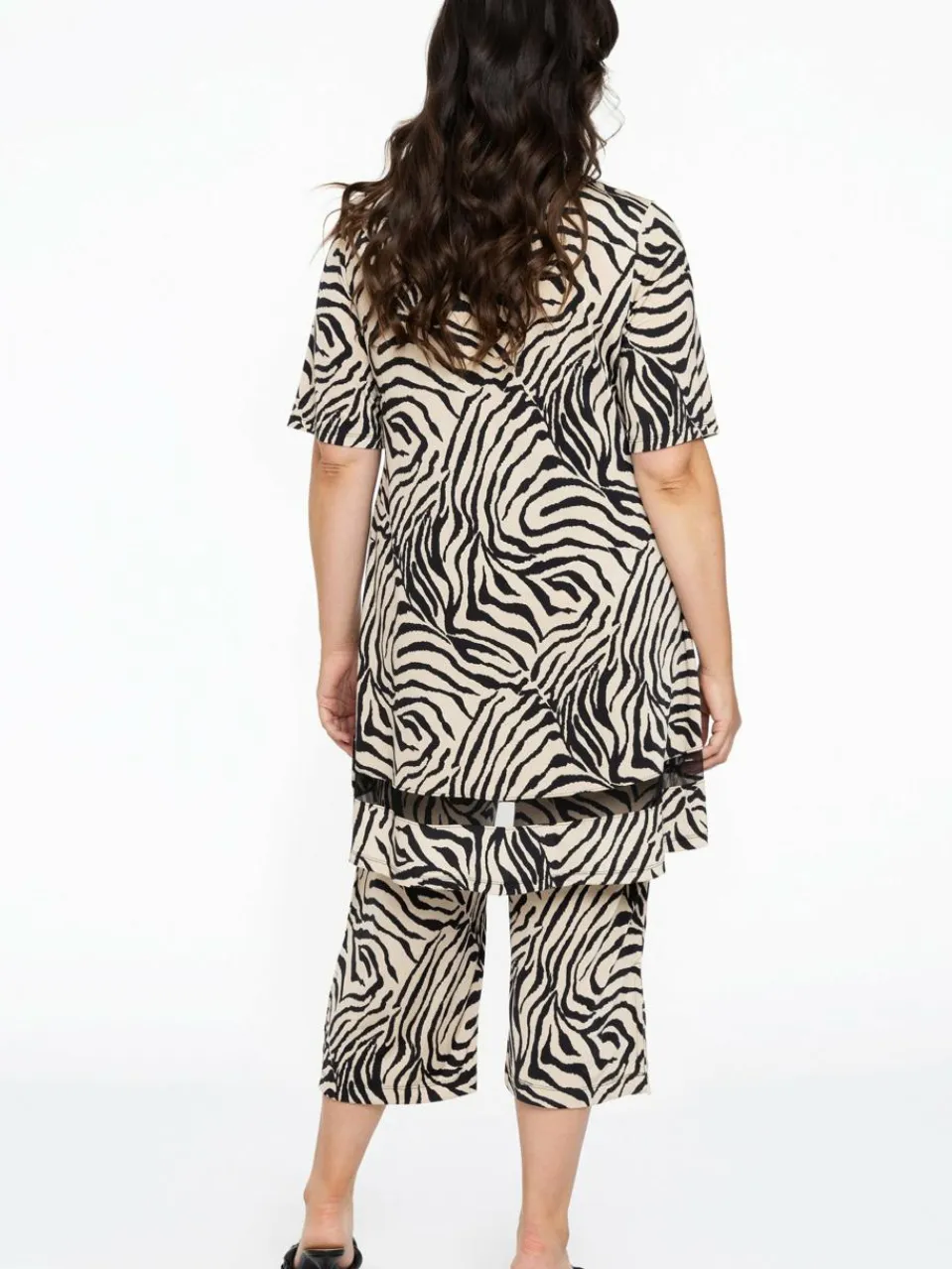 Auffällige Tigerstreifen zieren diese Hose. Sie sind aus Dolce-Material gefertigt und haben einen elastischen Bund. Die Hose hat eine 7/8-Länge und ist mit Schlitzen am Saum versehen. Das perfekte Paar, wenn Sie an heißen Sommertagen eine Hose einem Rock vorziehen!
