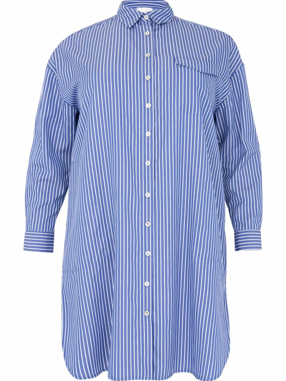 Knackige, übergroße geknöpfte Hemden sind der Weg, um einen coolen Preppy-Look für die Wochenenden zu kreieren. Dieses Blusenkleid aus einem Baumwoll-Mix ist mit einem blau-weißen Streifen bedruckt und hat Seitenschlitze. Verschluss mit Perlmuttknöpfen auf der Vorderseite, mit Nahttaschen und einer sichtbaren Brusttasche.