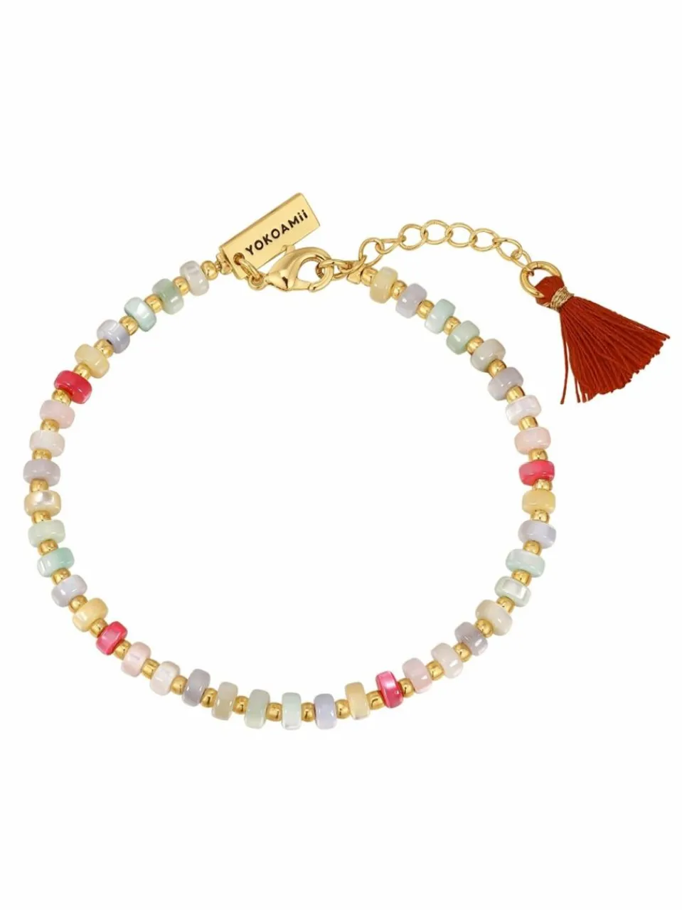 Du trägst gerne extravaganten Modeschmuck, den nicht jeder hat? Dann ist dieses Armband des jungen Trendlabels YOKOAMii dein neues Lieblingsstück! Inspiriert vom angesagten Boho-Look zaubert das Bracelet mit seinem fröhlich-bunten Materialmix schon beim Anlegen ein Lächeln aufs Gesicht. Kleine, 14-karätig gelbvergoldete Messingperlen wechseln sich mit gefärbten Muschelkernperlen ab. Liebevolles Detail ist eine freche Textil-Quaste.