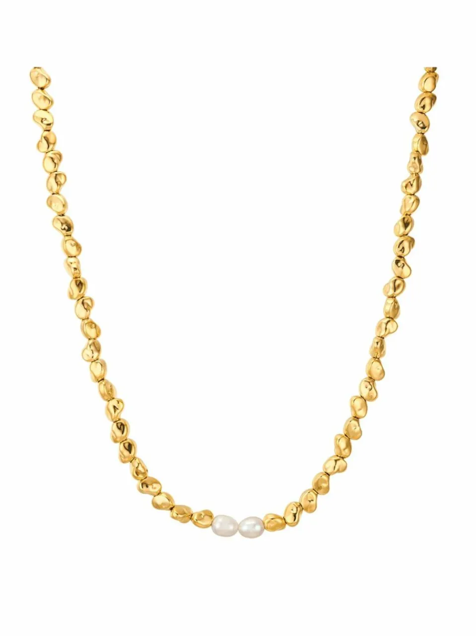 Du liebst stilvolle Perlen-Accessoires in ungewöhnlichen Designs? Dann ist diese Kette des Trendlabels YOKOAMii wie für dich gemacht! Blickfang ist der üppige Strang aus kleinen Perlen-Nachbildungen aus 14-karätig gelbvergoldetem Metall. Zwei handverlesene Süßwasser-Zuchtperlen setzen im Dekolleté einen edel schimmernden Kontrast zum warmen Goldglanz. Die unregelmäßige Potatoform der Perlen strahlt Natürlichkeit aus und macht jede Kette zum Unikat mit Charakter.